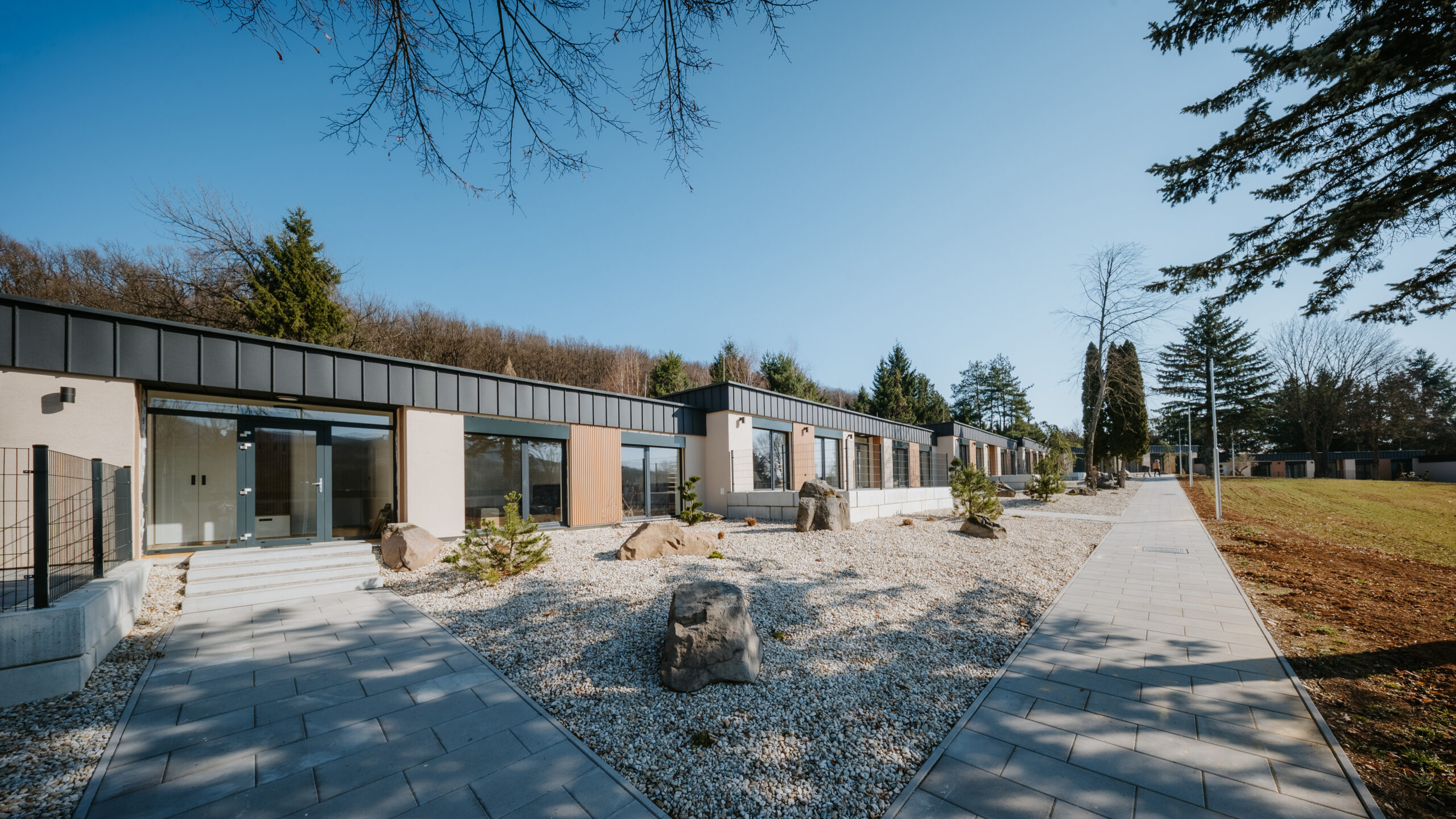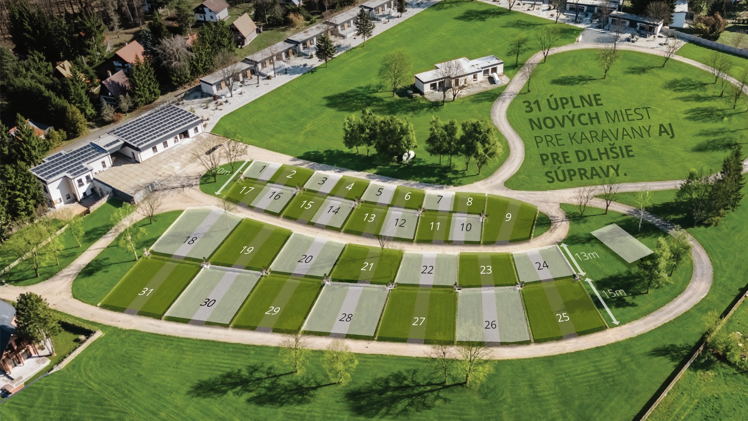 Objavte nový priestor pre oddych. 11 plne vybavených apartmánov s rozlohou 80 m² a 31 miest pre karavany ponúkajú dokonalé spojenie komfortu, slobody a prírody.